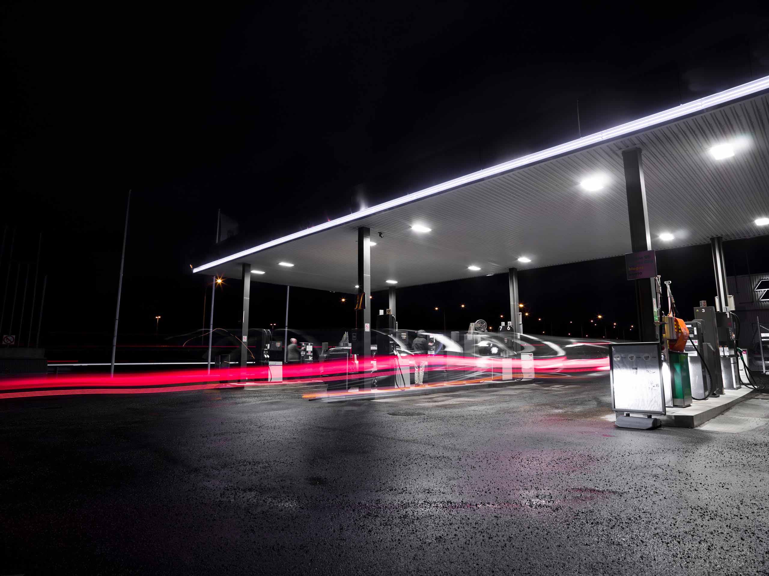 Ausweichen vor einer roten Ampel über ein Tankstellengelände